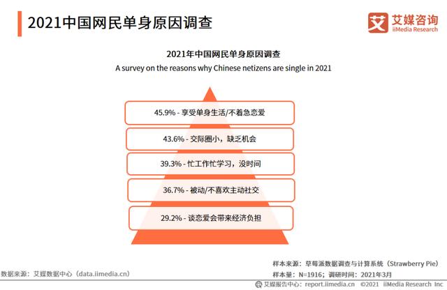 艾媒咨询发布的《2021中国单身群体消费行为调查及单身经济趋势分析报告》显示,今年第二季度,在中国单身时长以年为单位的单身人士已高达 73%,其中有43.6%的单身人士单身时长为3年以上;7.1%的人无恋爱经验。