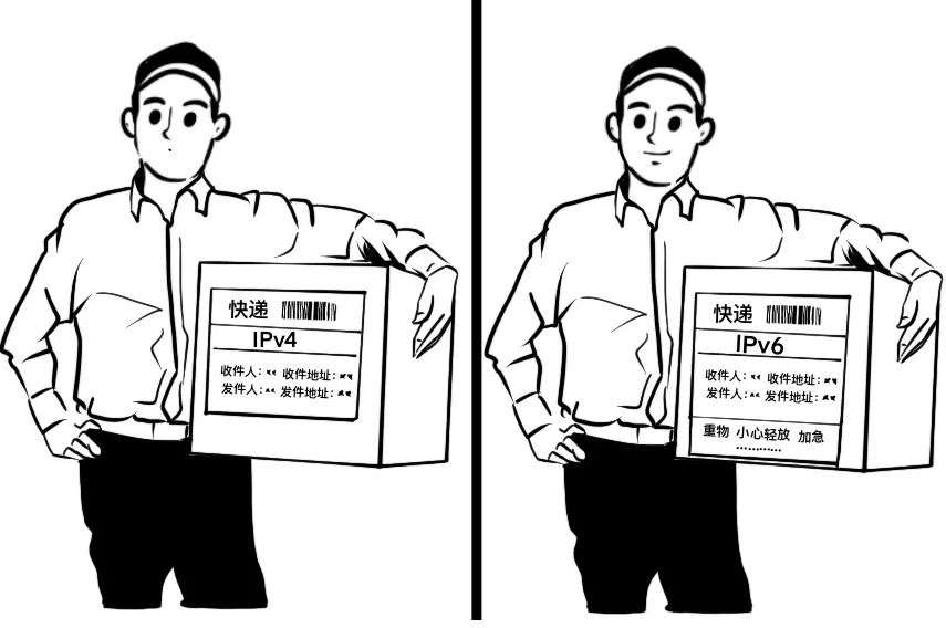 IPv6的快递系统,纸箱上可以贴更多的标签,标识纸箱里的货物属性,例如重货、易碎品、紧急文件等。系统根据标签,可以快速判断这个快递包裹所需的服务,例如需要加急、需要小心轻放等。