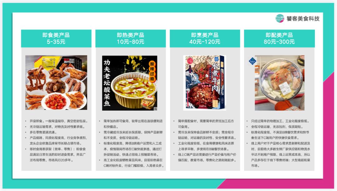 若从用户体验上来看,预制菜可以分为即食、即热、即烹、即配四大类:其中即食类产品开袋即食,尽管消费频次较高,但产品定位相对低端,且同质化程度高,市场已经呈现红海局面;即热产品需要加热食用,大多出现在便利店和外卖店等场景中,如今正向C端渗透,但行业门槛较低,且主要对标外卖产品;即烹产品需要一定烹饪条件,尽管消费频次相对较低,但品质化程度较高,符合消费升级的整体趋势,目前零售化进程刚刚起步,处于跑马圈地的阶段;而即配产品工业化程度较低,运营成本较高,现阶段还有待进一步跑通商业模式。