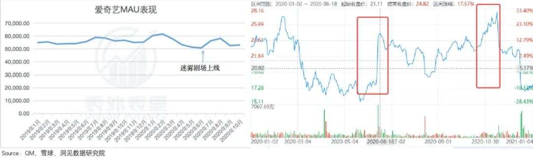 在迷雾剧场爆款的提升下,爱奇艺MAU和股价都迎来迎来一波新高。