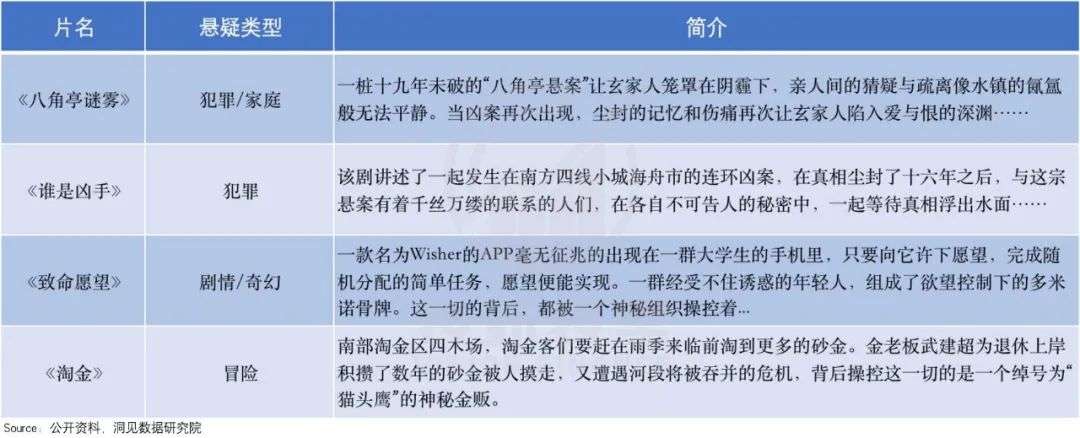 而将这样的标准,放在第二季迷雾剧场已发布预告的4个剧目上(如下图),可以看到,最有爆款潜质的是《八角亭谜雾》和《致命愿望》。