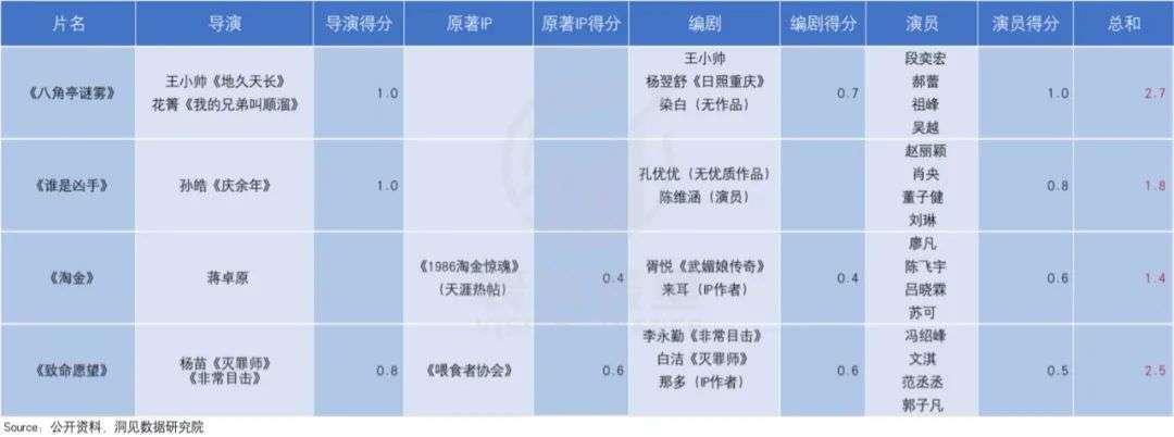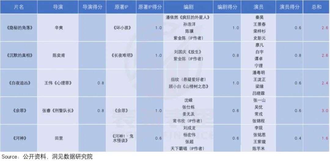 ·导演:满足有悬疑剧经验,有著名代表作两个条件的为1分;满足一个条件的0.5分;实际按此标准增减。