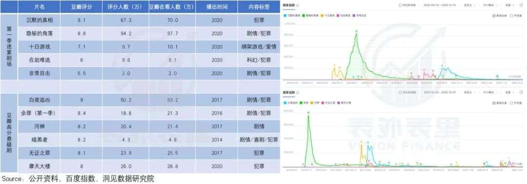 我们根据豆瓣评分、评分人数以及百度指数的综合表现,在近几年有知名度的悬疑剧中,筛选出了最符合爆款标准的5部爆款悬疑剧——《隐秘的角落》《沉默的真相》《余罪》《白夜追凶》《河神》。