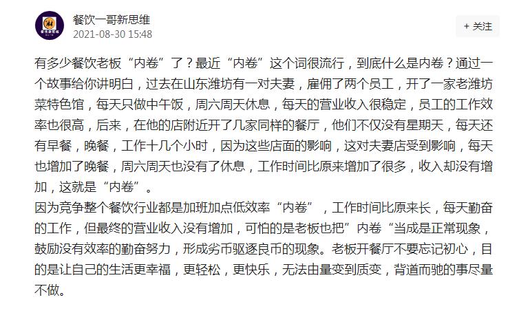 至于什么是内卷,想起网上曾看到的一段话,把餐饮内卷描述的颇为生动。