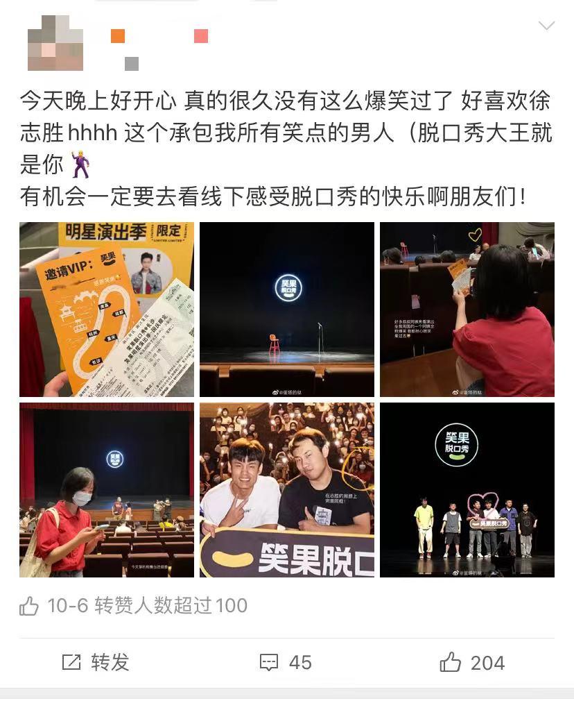 据笑果文化透露,其首次在十一黄金周期间举办了笑果明星演出季巡演,分别在成都、重庆、长沙、南昌、杭州五个城市举办了10场演出,选择都是千人级别的剧场,近万张门票售罄;与此同时,在上海的自营场地笑果工厂,十一期间同样每天保持两场演出的频次。