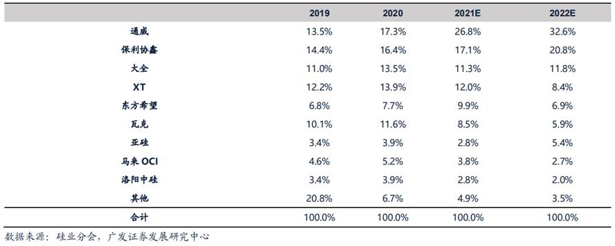 除此之外,上文提到的产能壁垒会使得头部效应进一步加剧,21/22 年年底硅料 CR5将分别达到77.1%和80.6%,显著高于20年 68.8%的集中度水平。