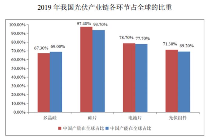 而中国光伏产业,正是在这一次次的潮起潮落中脱颖而出蜕变成全球光伏龙头。根据中国光伏行业协会的统计,2019 年中国多晶硅、硅片、光伏电池、光伏组件占全球的产量占比分别达 67.30%、97.40%、78.70%和 71.30%。