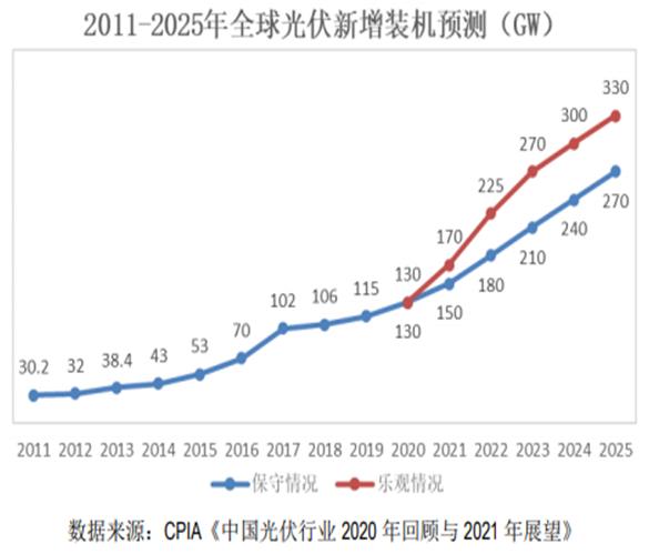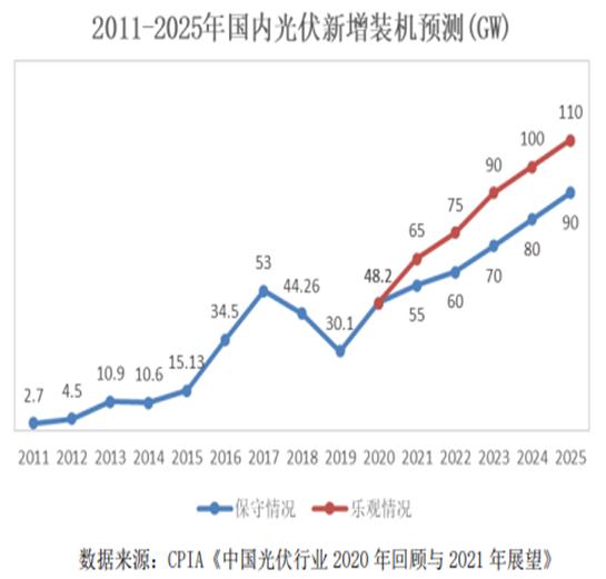 因此,要实现碳中和就必须从发电端实现清洁能源替代,根据国家发改委能源研究所的预测,到2025年,光伏总装机规模达到7.3亿千瓦(730GW,相当于2020年底的2.9倍),占全国总装机的24%,全年发电量为8770亿千瓦时,占当年全社会用电量的9%。