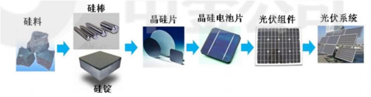 硅料企业购入工业硅粉,生产出多晶硅料;硅片企业购入多晶硅料,生产出硅片;电池片企业购入硅片,生产出电池;组件企业购入电池片,进行组装;最后终端需求落在电站建设上。