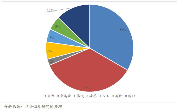 大家都清楚,若某一行业存在较深的壁垒,那么便存在着进入者障碍,在需求释放的前提下,行业发展前景就更加明确,而多晶硅的产能壁垒,除了前文所提到的之外,从成本构成上来分析也较为清晰,从下图中,我们明显看出硅料大部分的成本来自电力和原材料。