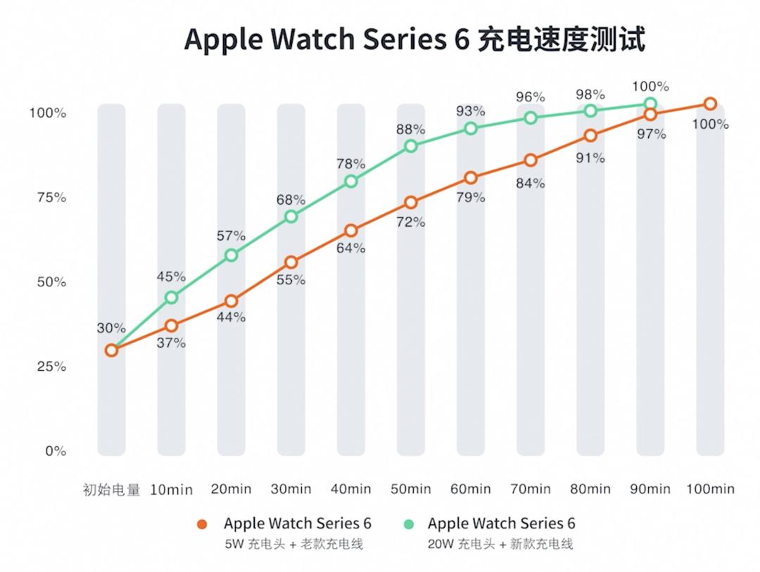 如果你使用过去的 A 口充电器给 Series 7 充电,我们测出的结果是 106 分钟,与 Series 6 基本持平。
