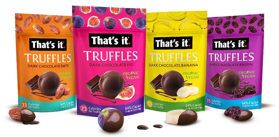 与Solely类似,That's.It Nutrition是一家专注于水果和蔬菜的健康零食供应商。致力于用最干净、最简单的原料制作美味的、以植物为基础的超级小吃。That's.It最新发布的Dark Chocolate Truffles是一种以真实水果为夹心的黑巧克力松露,仅采用三到四种成分制成,每块热量仅为23-33卡路里,仅含传统松露巧克力的1/4的糖和1/7的脂肪。