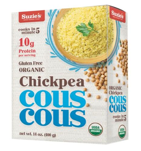 Suzie's Chickpea Couscous鹰嘴豆粗麦粉仅由鹰嘴豆面粉和水制成。每份400克产品中含有 10 克蛋白质,富含纤维,不含麸质。只需加水并加热 5 分钟便可食用。这款产品,获得美国食品行业的“学院奖”Nexty奖的提名。