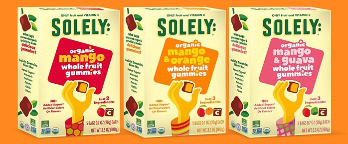 有机水果干和干果品牌Solely于今年年初推出了Solely Organic Whole Fruit Gummies,一款用有机整果制作的水果软糖,其配方仅包括真实水果和维生素C,每袋含有 0.7 盎司水果,热量仅为 60-70 卡路里。除了不添加任何糖、防腐剂、明胶、色素或树胶外,这种健康的新型植物性零食还通过了美国农业部有机、犹太洁食和非转基因认证。