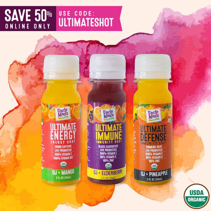 Uncle Matt也采用了在果汁中加入功能性植物成分的策略,推出系列shot型果汁饮料。产品采用益生菌等成分制成,旨在针对特定功能,如免疫支持、消化和能量。