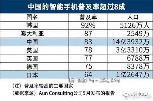 从营销咨询企业Aun Consulting于5月公布的全球智能手机普及率来看,日本为64%,而中国则达到83%。风险投资(VC)公司 Cyber Agent Capital社长近藤裕文指出,“在无现金支付等以智能手机为基础的服务方面,中国处于领先地位”。
