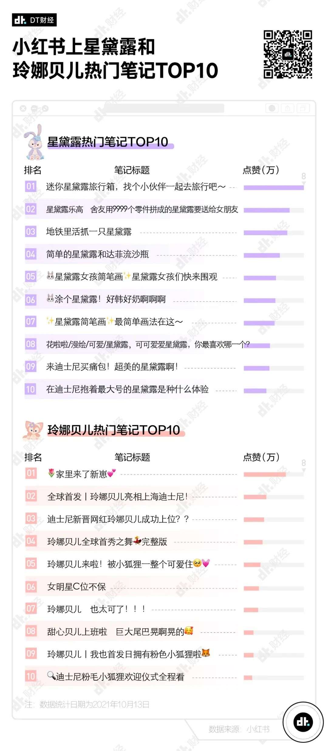 DT 君采集了小红书上与玲娜贝儿和星黛露相关的热门 TOP10 笔记——结果显示,在目前为止热度最高的 10 条玲娜贝儿相关笔记中,女孩们主要都是在分享(炫耀)自己和女明星的合影。