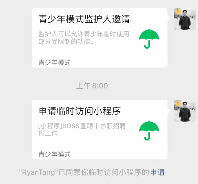 访问申请发出后,监护人在微信上会收到一个消息提示。点击通过后,被监护人就获得了该内容的访问权。