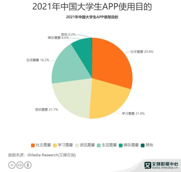 据iiMedia艾媒数据,从2021年中国大学生APP使用目的来看,29.4%大学生表示使用APP出于社交需要,21.8%大学生表示使用APP出于学习需要,21.7%大学生表示使用APP出于咨询需要。