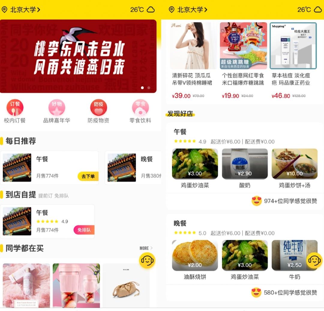 如京东推出的梨涡,在发布之初就提供了本地商家服务的功能,带点金融性质的社交产品在校园积累了流量后,可以为京东的金融业务导流,为学生群体提供白条分期服务;相似的美团也在“俺来也”上延续了020的电商模式,为主营业务带去了流量。