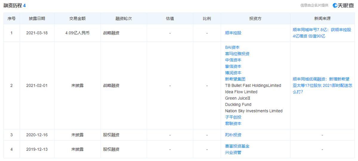 今年3月,顺丰通过全资子公司顺丰泰森对同城实业完成新一轮增资,金额达4.09亿元,完成后,顺丰对同城实业持股比例将从65.46%增加至66.76%。