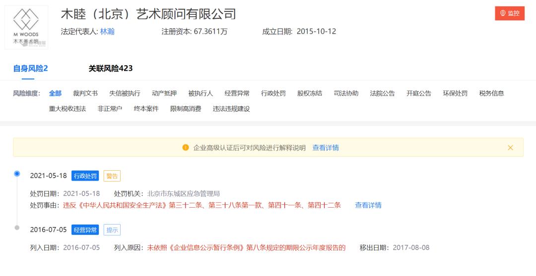 今年5月,由林瀚实际控制的木睦(北京)艺术顾问有限公司因“安全隐患”问题被北京市东城区应急管理局处罚34万元。