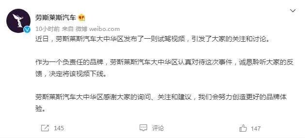作为一个负责任的品牌,劳斯莱斯汽车大中华区认真对待这次事件,诚恳聆听大家的反馈,决定将该视频下线。