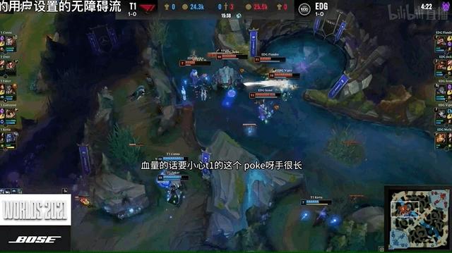 跟常规直播间不同的是,这个直播间是有AI实时字幕的,解说提到的队名“T1”、“poke”等黑话基本都能正确显示。