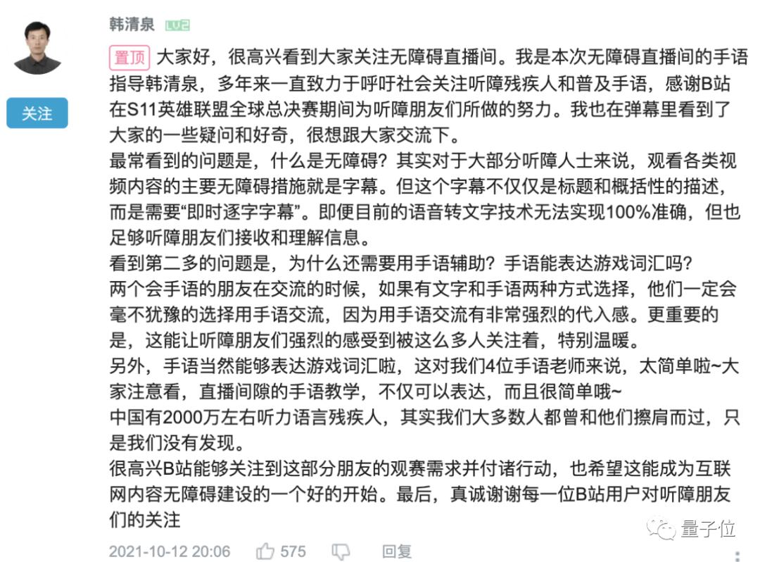 B站邀请了手语翻译的代表人物韩清泉老师,由其领衔的专业翻译团队来进行手语辅助,他们会在赛果播报及赛后采访环节提供实时手语翻译。