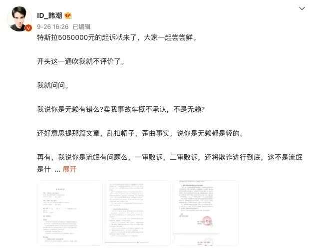 但就在韩潮发布胜诉消息后不久,特斯拉将其告上了法庭。9月27日,特斯拉公开回应称,截至目前,其与韩潮之间发生了多件诉讼案件,包括韩潮诉特斯拉的二手车纠纷案、特斯拉诉韩潮的两辆代步车纠纷案、韩潮起诉特斯拉的名誉权侵害纠纷案及特斯拉诉韩潮的名誉权侵害纠纷案。其中,韩潮诉特斯拉的二手车纠纷案已经二审判决,特斯拉已依据判决,向韩潮支付款项共计151.88万元,并将依法申请再审。