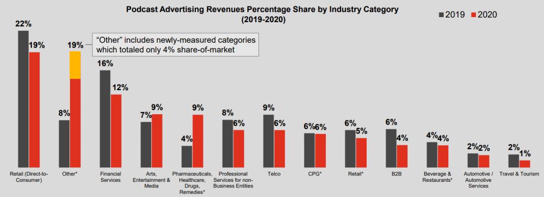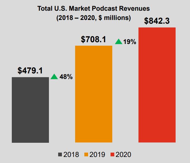 另一方面,美国播客的市场走向看似更加顺风顺水。据广告业务机构IAB(The Interactive Advertising Bureau)的报告,美国播客的广告收入已经在2020年达到了8.42亿美元,同比增长19%。这类广告收入预计将在今年超过10亿美元。