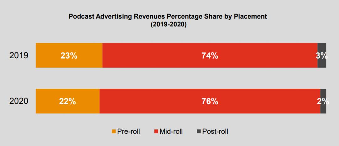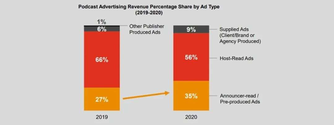 美国的播客广告则可以分为三个基本类型:播音员阅读/预先制作的广告,主持人口播广告和客户、品牌或机构直接提供的广告,三者在2020年的市场占比依次为35%、56%和9%。