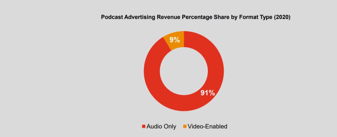 美国的播客市场也在尝试将视频与音频结合,去年,有9%的广告收入都来自于有视频相辅的播客节目。