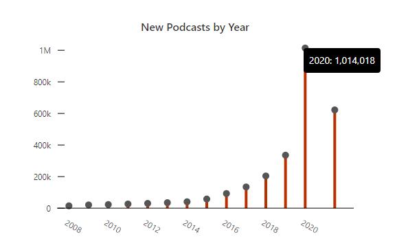 据Listen Notes数据,2020年,世界播客总量实现了前所未有的增长——新增了100万档以上的播客节目。
