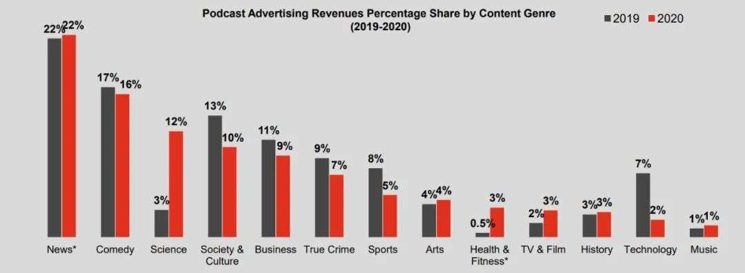 美国播客内容类型多元,分散布局在新闻、喜剧、科学、社会/人文、商业、罪案等多个领域。相关数据显示,在2020年,新闻和喜剧类内容获得广告收入占总市场份额的38%。
