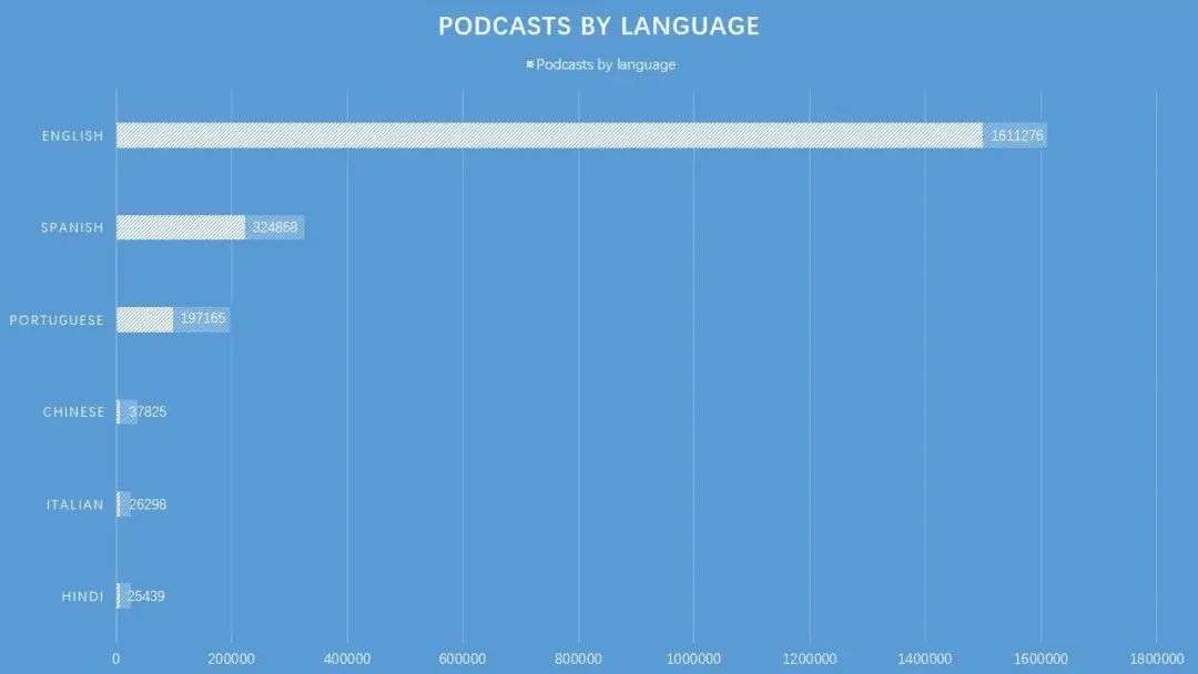 在国内的播客行业尚在成长期时,海外的播客已是一片欣欣向荣的景象。目前,161万档以上的播客节目都为英语,是数量排名第二的西班牙语节目的将近五倍。