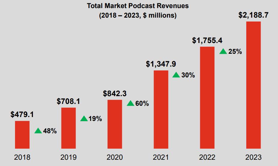其次,尽管经济呈现下行趋势,但随着播客听众人数的增加,播客的广告收入得以增长。