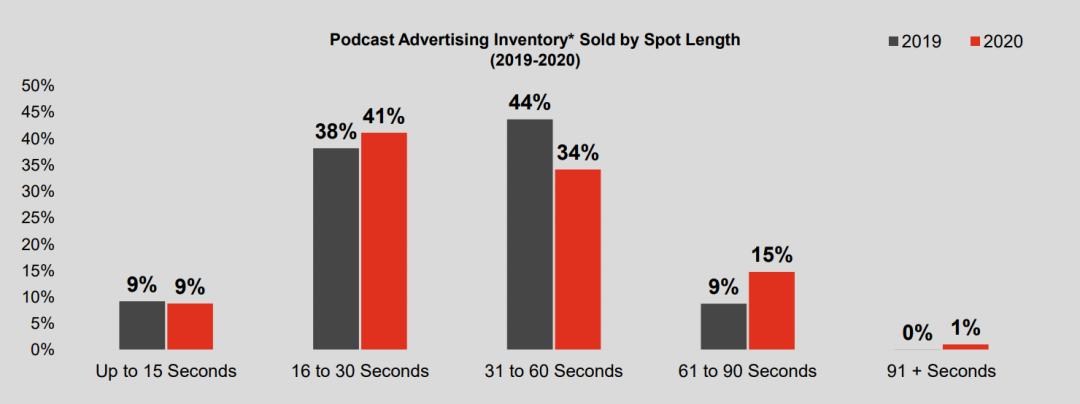 这些播客广告的时长正在逐渐延长。去年,虽然84%的广告都短于1分钟,但61-90秒的广告比例有所增长,同时也出现了长于90秒的广告。