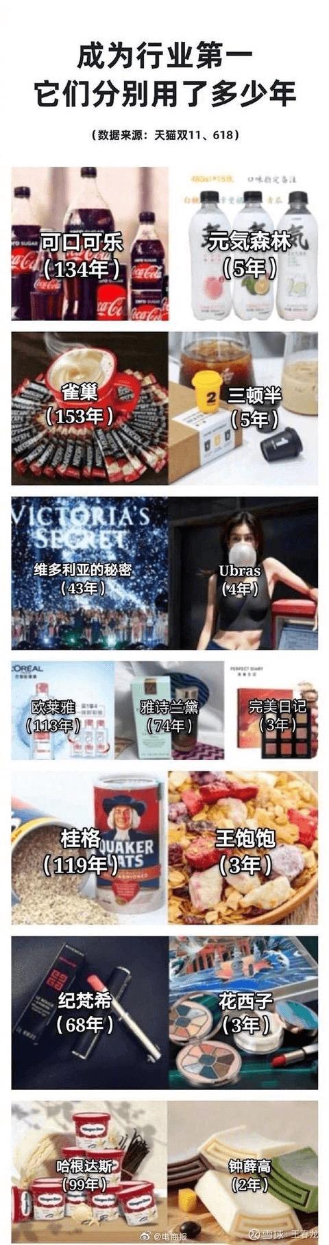 之前有一张新消费品牌代表的图片广为流传:成为行业第一,可口可乐用了134年,雀巢用了153年,欧莱雅用了113年,雅诗兰黛用了74年,哈根达斯用了99年,纪梵希用了68年……而“新势力品牌”从诞生到成名的时间却十分短暂:元气森林5年,花西子3年,完美日记3年……