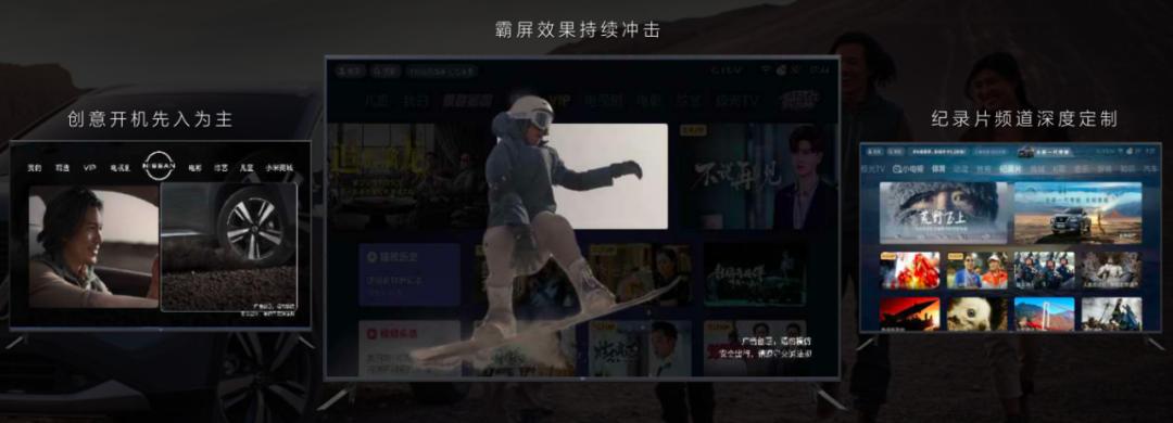 东风日产则与小米OTT合作,通过3D创意视觉占领观影路径,从开机时的创意视频,到开机后的霸屏效果,再到纪录片频道深度定制的内容,对用户视觉进行持续冲击。用户愿意自发分享的优质创意内容,再加上OTT大屏的冲击力,就可以对用户形成视觉冲击。品牌在用户注意力涣散时,完全可以获得其“聚精会神”的关注。