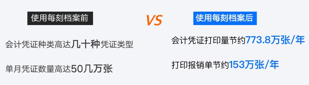 无需登录各个系统逐次打印、归纳、整理,而是在业务流程处理完成后,自动归档入系统。在上线每刻档案后,打印凭证约节约773.8万张/年,打印报销单节约153万张/年。