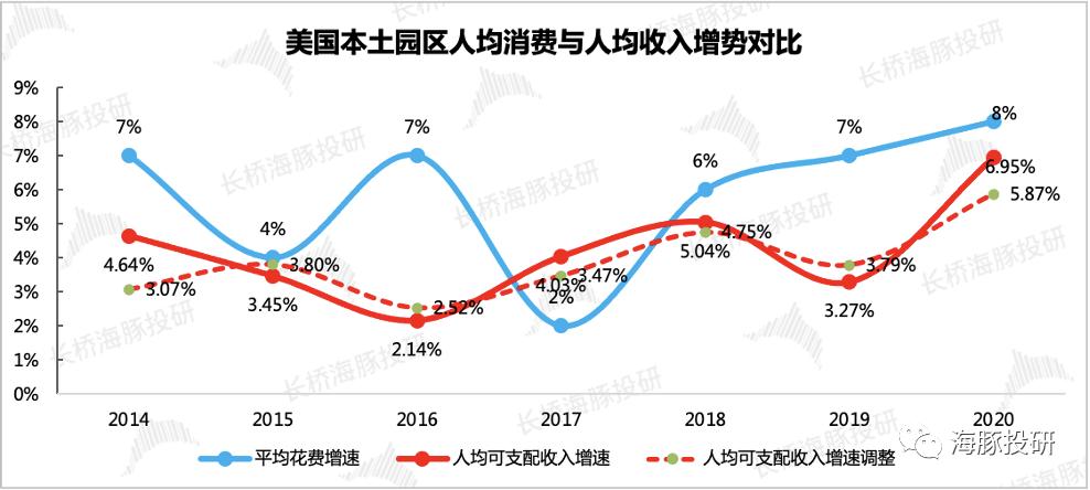 从历史人均消费变化趋势来看,增速并不低,与客流量的不增长明显有区别。单独拎出美国本土情况来看,增势比较符合宏观上人均可支配收入的变化趋势。