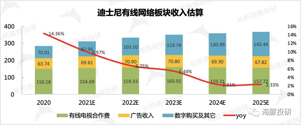 4、有线电视随产业趋势,增速逐年加速下滑。 但部分国际市场用户迁移速度相对较慢,迪士尼旗下频道和内容还可以在国际市场享受最后的成长红利。2021-2025年5年符合增速在5.3%。