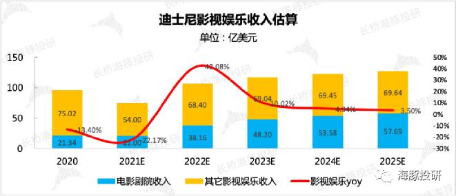 3、电影年推出15-20部,2022财年pipeline较多,包含不少大片。 结合普华永道对行业预测情况,2025年电影收入恢复至2019年水平(考虑到中国电影市占率提升,且文化管制等原因。迪士尼等美国电影在2019年基础上进一步渗透难度较大)。给予2021-2025年复合增速5.7%,略低于全球的8%。