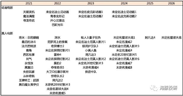 在买21世纪福克斯之前(2018年之前),迪士尼每年上映影片大概在13部左右。2019年发片较多,达到了19部。如果单论迪士尼的排片计划(2021-2026年),再结合历史情况,海豚君预计未来每年上映影片基本在15部以上,并随着疫情的好转逐步爬坡稳定阶段的18部/年。