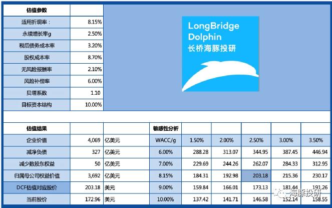 按照DCF估值方法,在WACC=8.15%,g=2.5%下,迪士尼的公司价值在3692亿美金,对应203美元/股。相对当前市值,存在17%的空间。