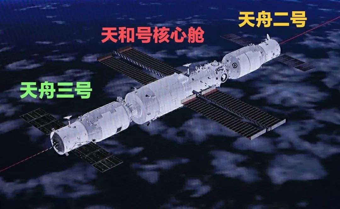 对接完成后的中国空间站,将形成以天和核心舱 + 天舟二号货运飞船 + 天舟三号货运飞船 + 神舟十三号载人飞船所构成的四舱(船)组合体,总吨位将首次突破50吨。