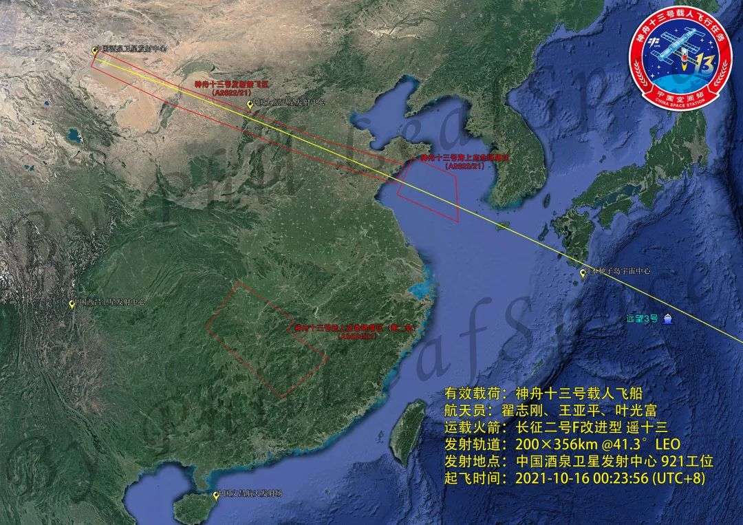 神舟十三号从我国唯一的载人发射场酒泉卫星发射中心起飞后,一路向东偏南方向飞行,途径内蒙、宁夏、陕西、山西、河北、山东等省,最终在黄海上空入轨,进入了200 × 356千米 × 41.5°的轨道。在进入远望3号的测控区域,即起飞后约12分钟后,太阳帆板展开。