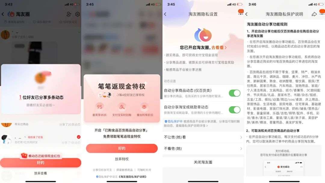 老实说它也不是“问我”,而是用满屏的“XXX(好友名)给你发了红包”、“笔笔返现金特权”等诱导性语句,让我以为只是日常的领金币、发优惠的活动,所以就按照指示一步步开通了淘友圈,并且同意了“已购食品百货商品自动分享”。