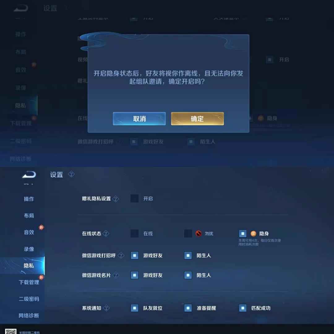 可能后来腾讯也察觉到被“查岗”的召唤师太多了,就上线了隐身功能。但这个隐身功能怎么说呢,就是有又觉得没有。每周7天你只有5天可以隐身,而且每次上线都需要重新设置隐身状态,这个就很奇葩,因为经常是上线之后就开局了,很容易忘记。还有一点就是,隐身的状态下,队友是没有办法邀请你一起游戏,也是有各种不方便之处。